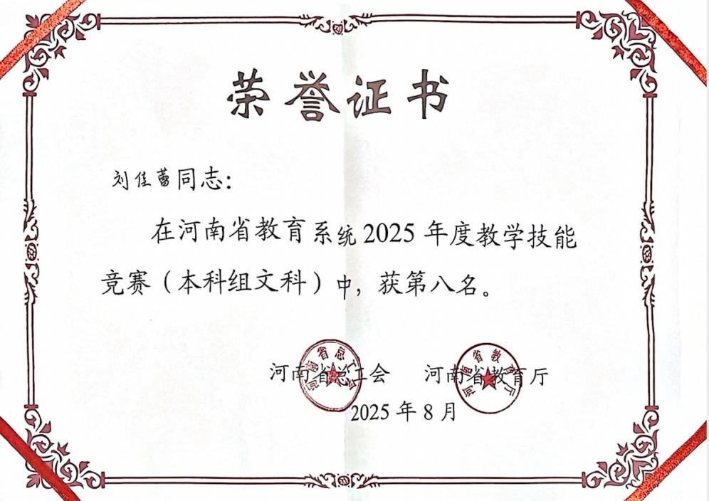 2025年8月25日至31日,由河南省总工会、河南省教育厅主办,河南省教科文卫体工会和洛阳理工学院承办的河南省教育系统2025年度教学技能竞赛决赛,在洛阳理工学院举行。我院刘佳蕾老师代表学校参加“本科组文科”比赛,凭借出色的教学表现,最终荣获全省一等奖第八名的优异成绩。