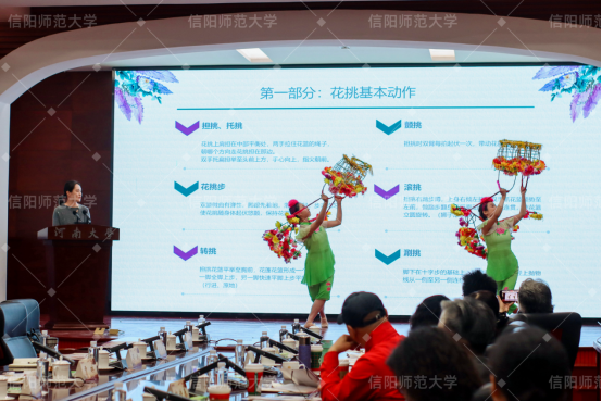 课程汇报由冯燕副教授主讲,以《信阳三花舞》为题,从历史渊源、形态构成、文化价值与教学实践四个方面进行系统展示,对“花挑舞、花伞舞、花鼓灯、火淋子”等信阳地域舞蹈的文化特征与体系结构进行了梳理,呈现了三花舞在淮河流域的传承脉络及其非物质文化遗产保护实况。与会专家学者对我校在地方舞蹈文化研究领域的持续积淀和“三花舞”研究成果给予高度评价,认为我校团队在传统舞蹈“文化研究—动作整理—课堂教学—舞台创编”全链条建设方面具有显著优势,为中原地域舞蹈文化的传承与创新提供了重要经验与范例。