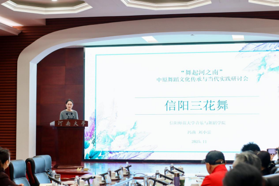 2025年11月14日至16日,由河南省舞蹈家协会、河南大学音乐学院联合主办的“舞起河之南——中原舞蹈文化传承与当代实践研讨会”在河南大学明伦校区召开。本次研讨会聚焦中原舞蹈文化的保护传承与当代创新,来自国内外多所高校、艺术院团及研究机构的专家学者齐聚开封,共同探讨中原舞蹈文化的历史脉络、艺术特色与当代创新路径。应大会邀请,我校伟德vb舞蹈教研室“信阳三花舞”科研团队参加会议,团队主创成员刘小雷、冯燕、陈依雯、李梦婷代表学校出席研讨与展示交流。