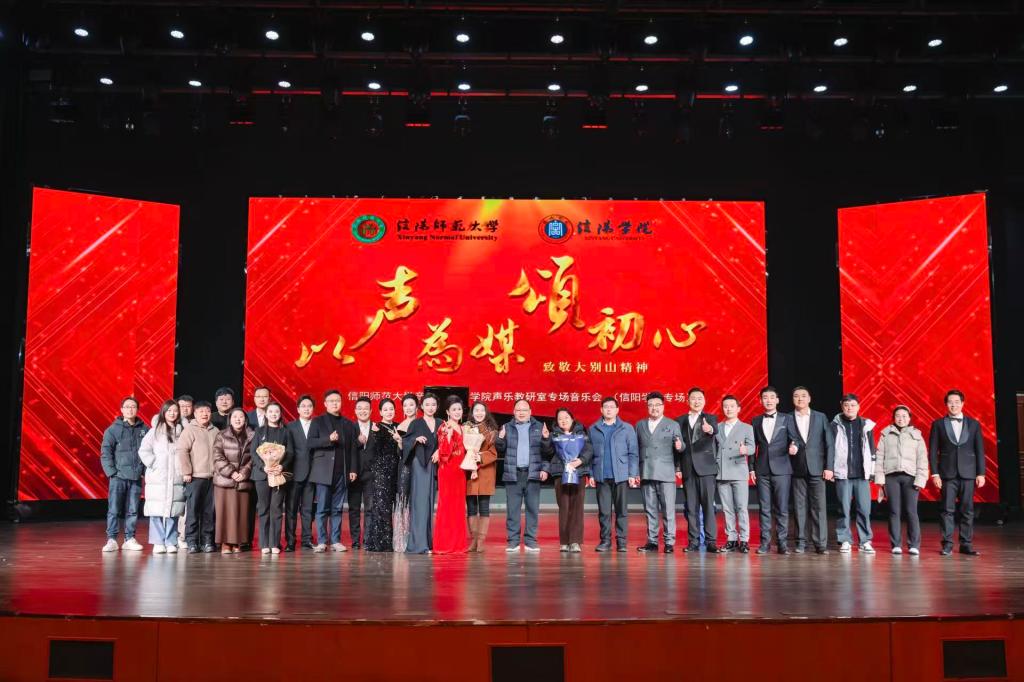 音乐会精选了《绣红旗》、《再见了大别山》、《英雄赞歌》等14首红色经典曲目。独唱的深情、重唱的和谐、合唱的磅礴,每一种演绎方式都让红色经典焕发出新的感染力。教师们倾注真情的演唱,让每一个音符都承载着历史的重量,每一个乐句都饱含着对英雄的敬意。演出接近尾声时,我校的演职人员齐唱校歌《托起民族的希望》,将现场气氛推向高潮。这段熟悉的旋律不仅是信阳师大师生对自身文化的深情告白,也作为沟通的桥梁,联结起三校师生共同的情感和对未来的期许。